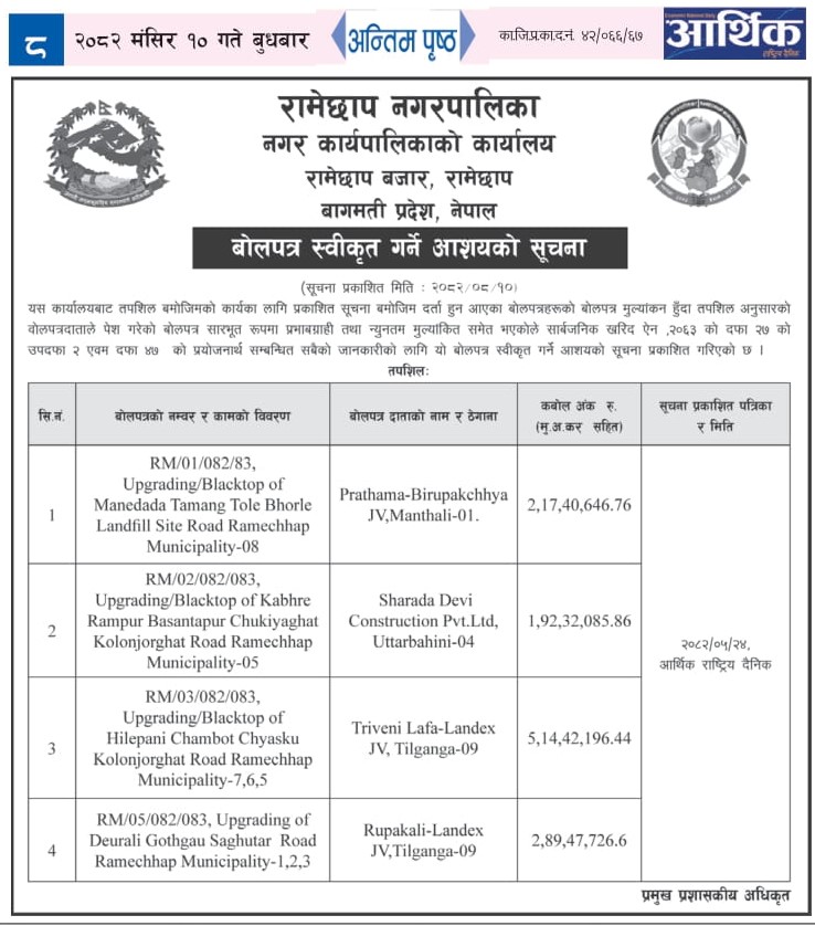 Home » बोलपत्र स्वीकृत गर्ने आशयको सूचना।