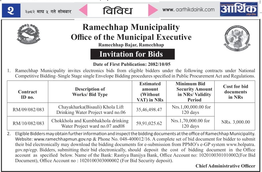 Invitation for bids (Chayakharka(Bisauli) Khola Lift Drinking Water Project ward no.06, Chokkhola and Kumbhakhola drinking Water Project ward no.07 and08)