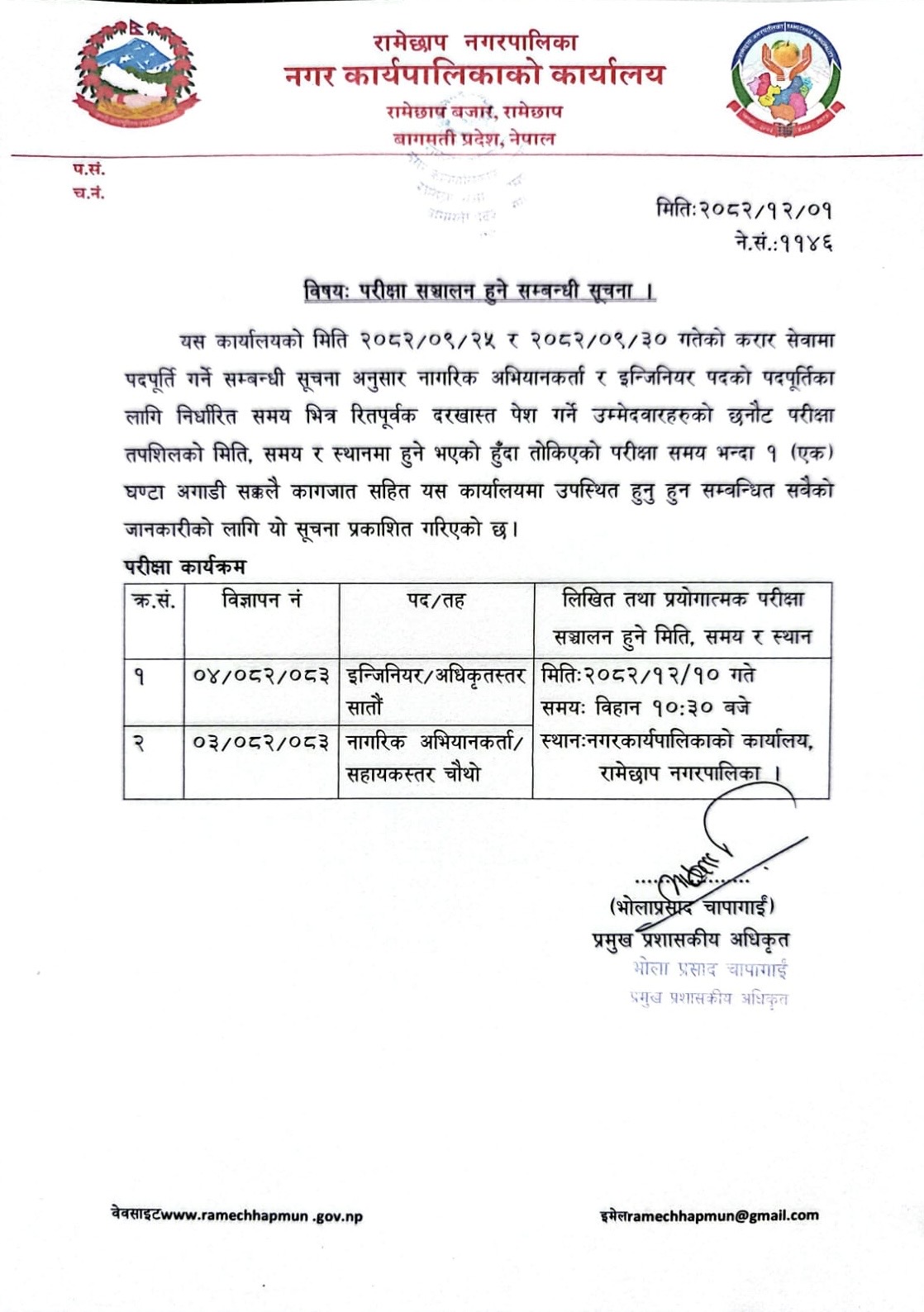 इन्जिनियर र नागरिक अभियानकर्ता पदको परिक्षा सञ्चालन हुने सम्बन्धी सूचना|
