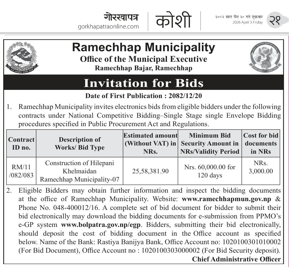 Invitation for bids (Construction of Hilepani Khelmaidan Ramechhap Municipality-07)