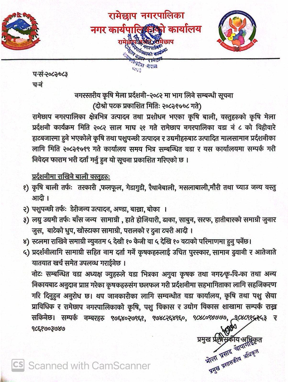 नगरस्तरीय कृषि मेला प्रर्दशनी- २०८२ मा भाग लिने सम्बन्धी सूचना। (दोस्रो पटक प्रकाशित मितिः २०८२/१०/०८ गते)